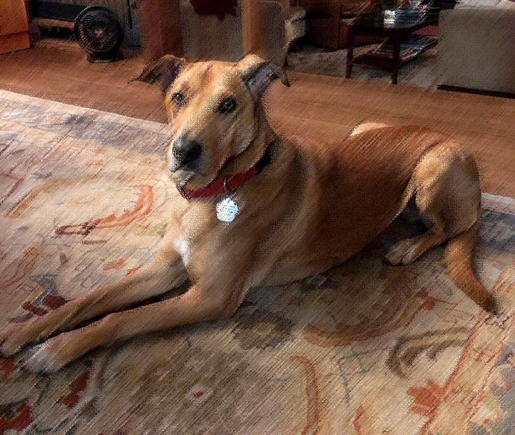 Leah is a rescue from Texas who came to us at age four or so. She is a total dear who loves all people, dogs, cats, and chipmunks. What she loves most, though, is to run — fast. She does not need a destination; running fast is an end in itself for Leah. When she runs through the house with a toy, it is best to step aside. Her legs are springs; she leaps high for the frisbee.